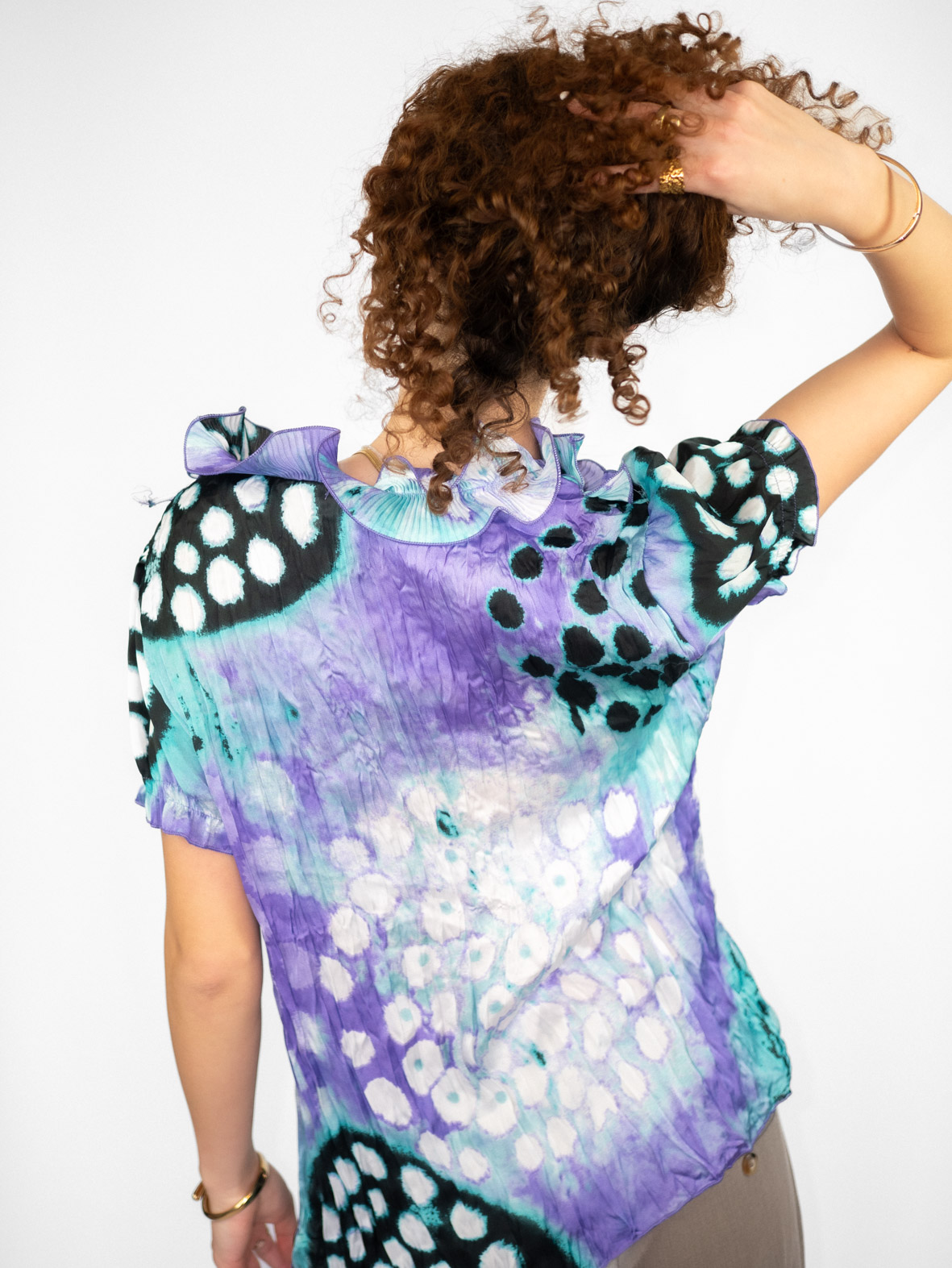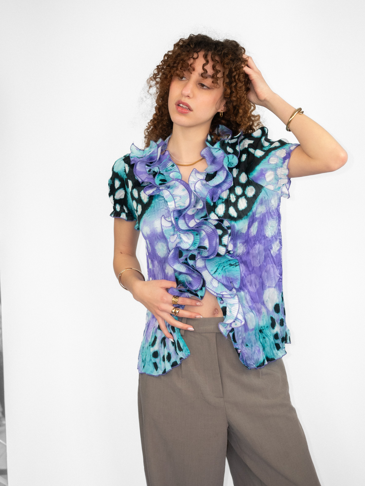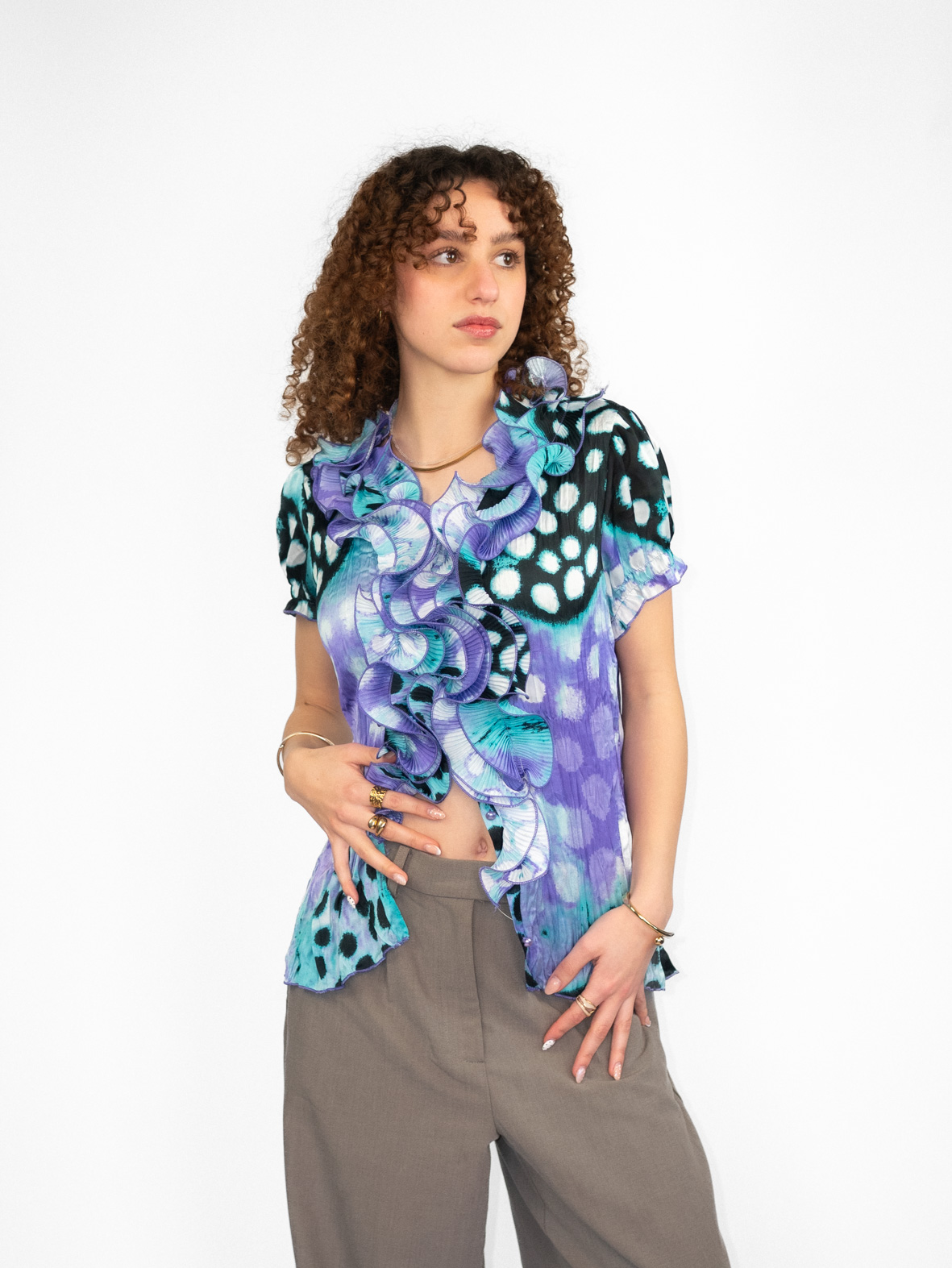 A flattering vintage ruffle top with a soft drape and feminine silhouette. A true one-of-a-kind piece that highlights the waist beautifully.