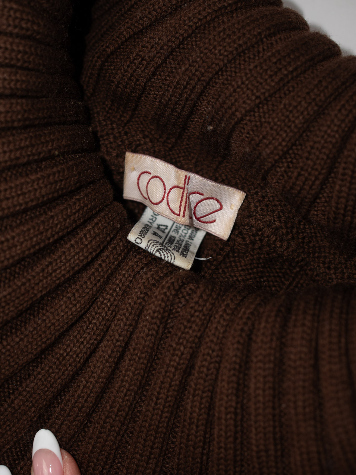 A statement piece: brown cable-knit sleeves combined with a genuine suede patchwork front and ribbed turtleneck. Warm, architectural and eye-catching.