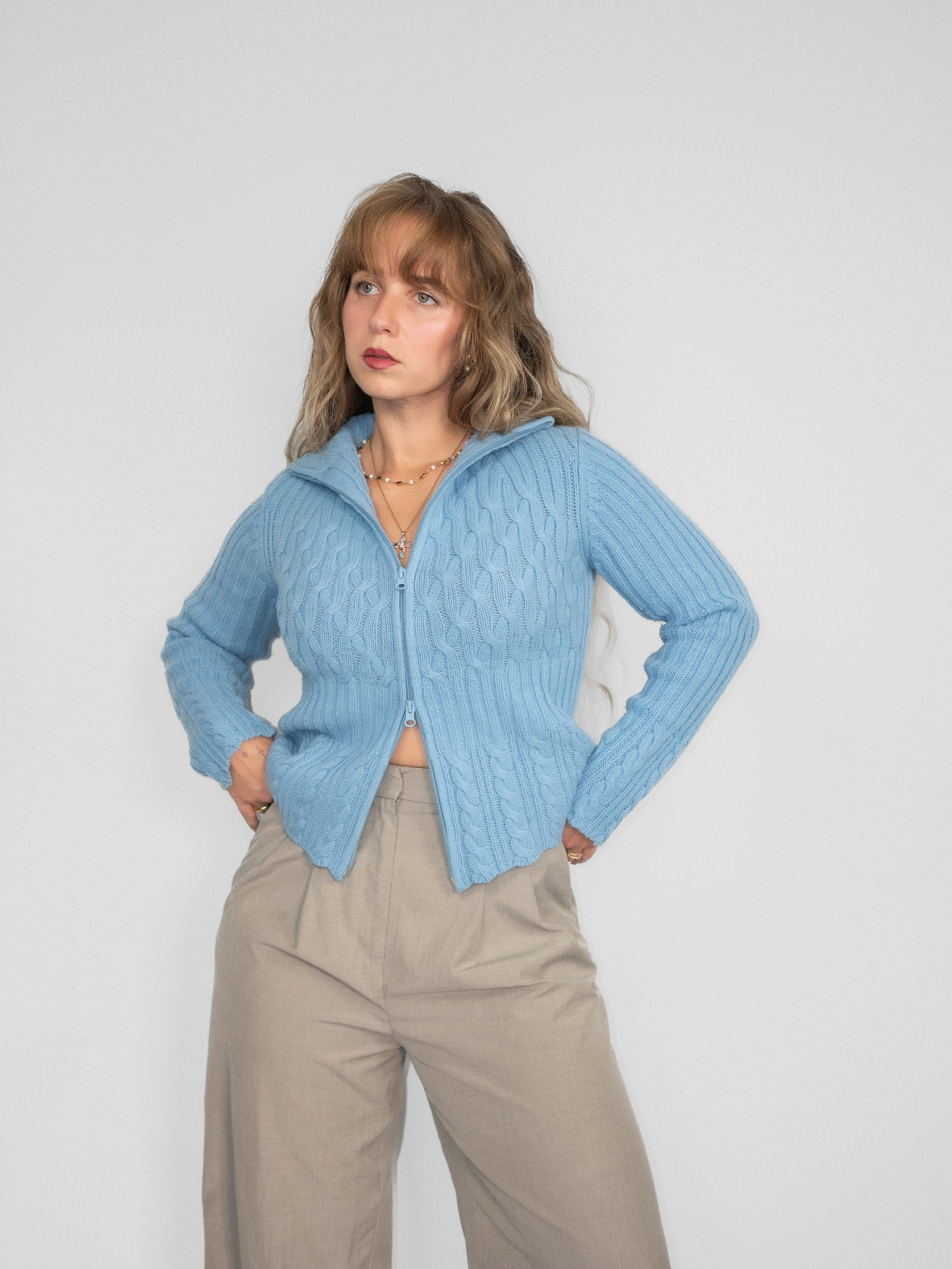 Soft, dreamy and oh-so-flattering. This sky-blue vintage knit zips up for endless styling options — from ballet-aesthetic outfits to simple everyday looks. Lightly scalloped edges add a subtle romantic touch.